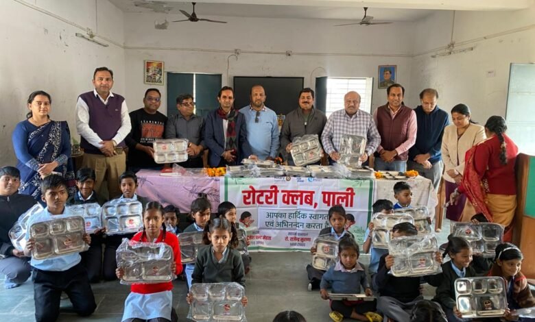 रोटरी क्लब पाली की सराहनीय पहल: सर्वोदय नगर स्कूल में 100 जरूरतमंद बच्चों को थाली सेट वितरित