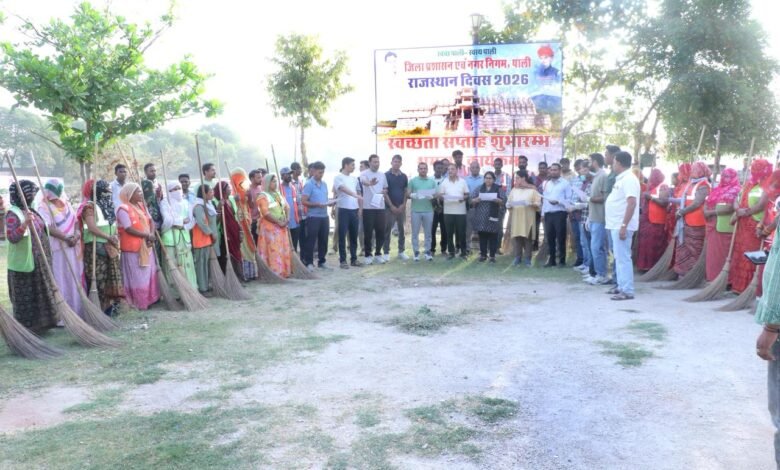 पाली : राजस्थान दिवस 2026 के अवसर पर पाली में स्वच्छता सप्ताह की शुरुआत शनिवार को लाखोटिया उद्यान में श्रमदान कार्यक्रम के साथ हुई। इस अभियान के तहत नगर निगम अधिकारियों, कर्मचारियों, जनप्रतिनिधियों और आमजन ने सामूहिक रूप से श्रमदान कर शहर को स्वच्छ बनाने का संदेश दिया।