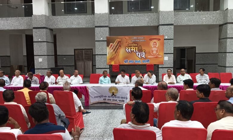 पाली : जैन समाज की सर्वोच्च संस्था श्री संघ सभा के तत्वावधान में शुक्रवार को बागर मोहल्ला स्थित श्री संघ सभा भवन में एक विशेष आयोजन हुआ, जिसमें सकल जैन संघ द्वारा सामूहिक क्षमायाचना की गई। इस अवसर पर समाज के सभी सम्प्रदाय घटक और संस्थाओं के पदाधिकारियों ने एक-दूसरे से “मिच्छामि दुक्कड़म्” कहते हुए क्षमा याचना की और मैत्री, सौहार्द एवं एकता का संदेश दिया।