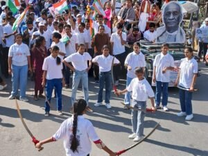 मार्च के दौरान युवाओं ने विभिन्न राज्यों की पारंपरिक वेशभूषा में सांस्कृतिक प्रस्तुतियों के माध्यम से “अनेकता में एकता” का संदेश दिया।