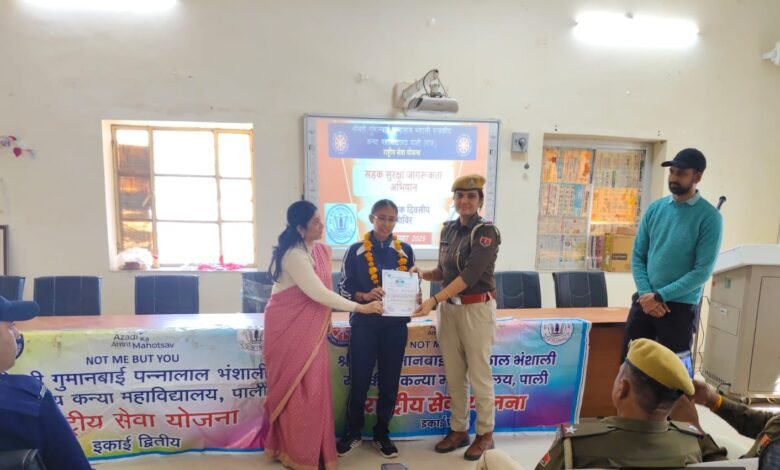 पाली : राजकीय कन्या महाविद्यालय, पाली में राष्ट्रीय सेवा योजना (NSS) के अंतर्गत आयोजित तृतीय एक दिवसीय शिविर के अवसर पर “सड़क सुरक्षा” विषय पर विशेष जागरूकता कार्यक्रम का आयोजन किया गया। कार्यक्रम की मुख्य अतिथि पाली शहर यातायात प्रभारी निरमा बिश्नोई रहीं, जिन्होंने छात्राओं को यातायात नियमों एवं सड़क सुरक्षा के महत्व की विस्तृत जानकारी दी।